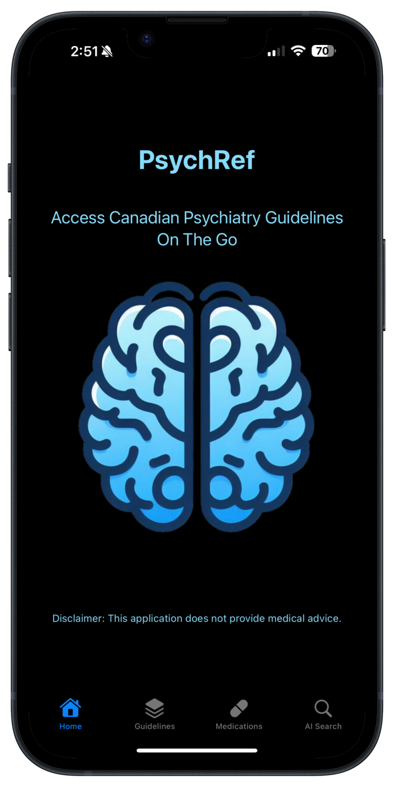 Navigate the field of psychiatry with confidence using PsychRef - your essential iPhone app for quick reference to treatment tables from evidence-based Canadian psychiatry guidelines.